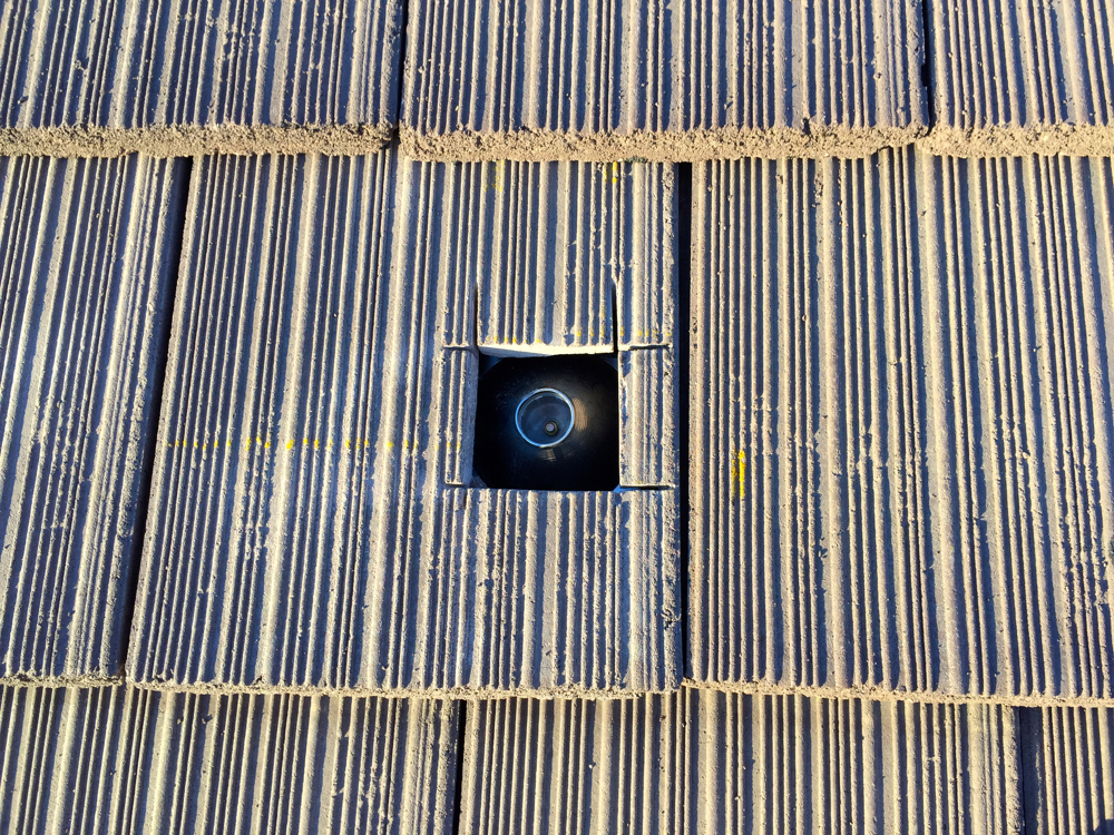 For the tile to clear the aluminum cone of the subflashing, the hole has to be pretty big. I tried doing a 2" hole before, as you can see here, but the tile is actually pressing down on the cone area underneath and not sitting flush against the surrounding tiles. The hole has to be about 3" for it to clear properly.